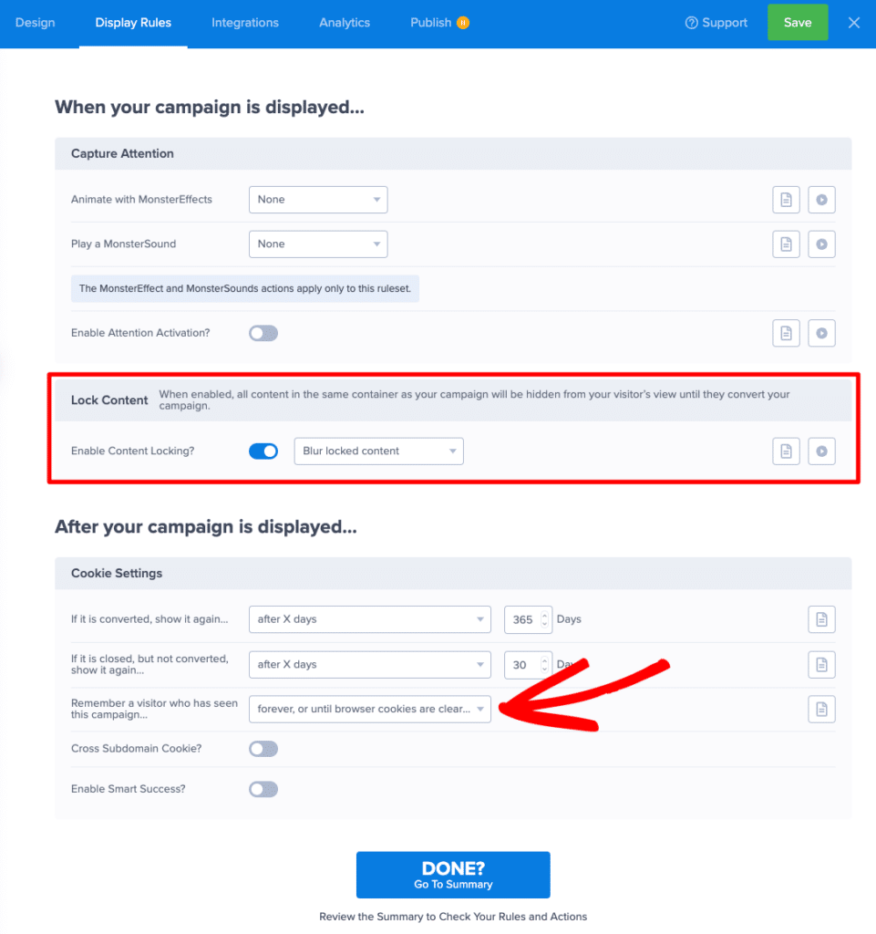 Now, you need to enable content locking. On the Actions page, switch Enable Content Locking on and choose whether your content is blurred or removed. Then, set your cookie settings for Remember a visitor who has seen this campaign… to forever.