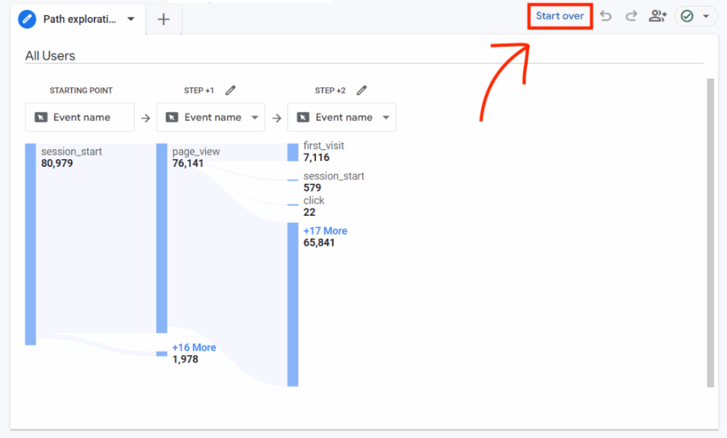 One of the most powerful features that sets GA4 apart from Universal Analytics is the ability to analyze user paths in both directions. The Start Over button, located in the top-right corner of your path exploration report, is your gateway to this functionality.