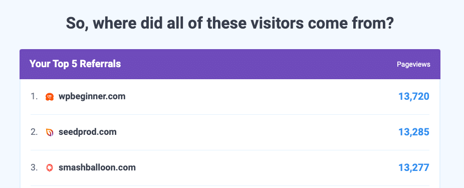 Are you focusing on building backlinks and forming more partnerships? The Top 5 Referrals report shows where you’re getting that important backlink/partnership traffic from: