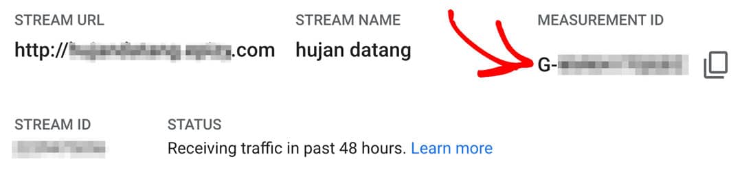 To find your GA4 Measurement ID, go to Admin » Property » Data Streams. Click on a data stream. The Measurement ID shows up in the stream details after the Stream URL and Stream Name.
