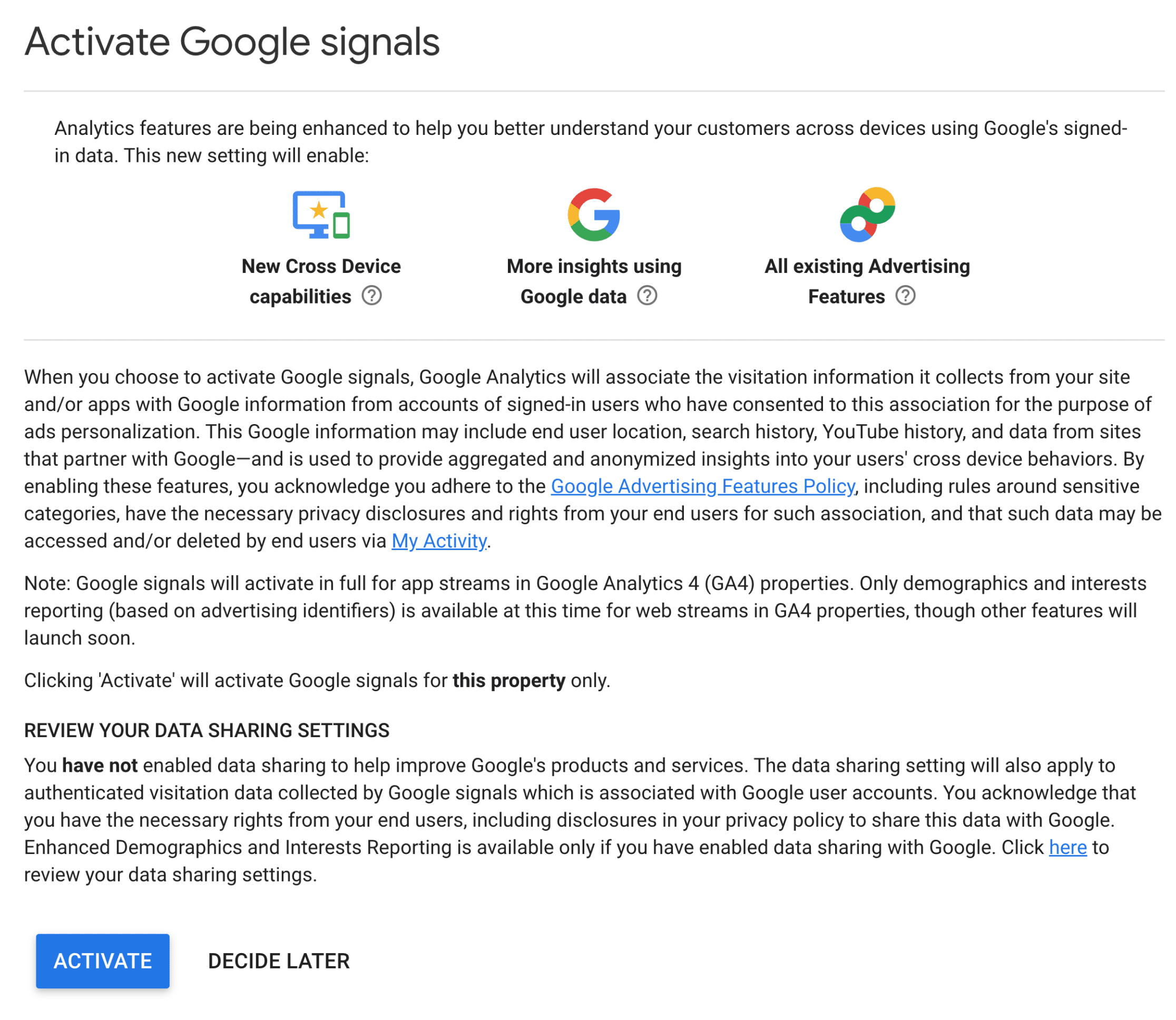 Once you’ve read through everything and clicked on Activate, Google signals collection will be active for that specific Google Analytics property.